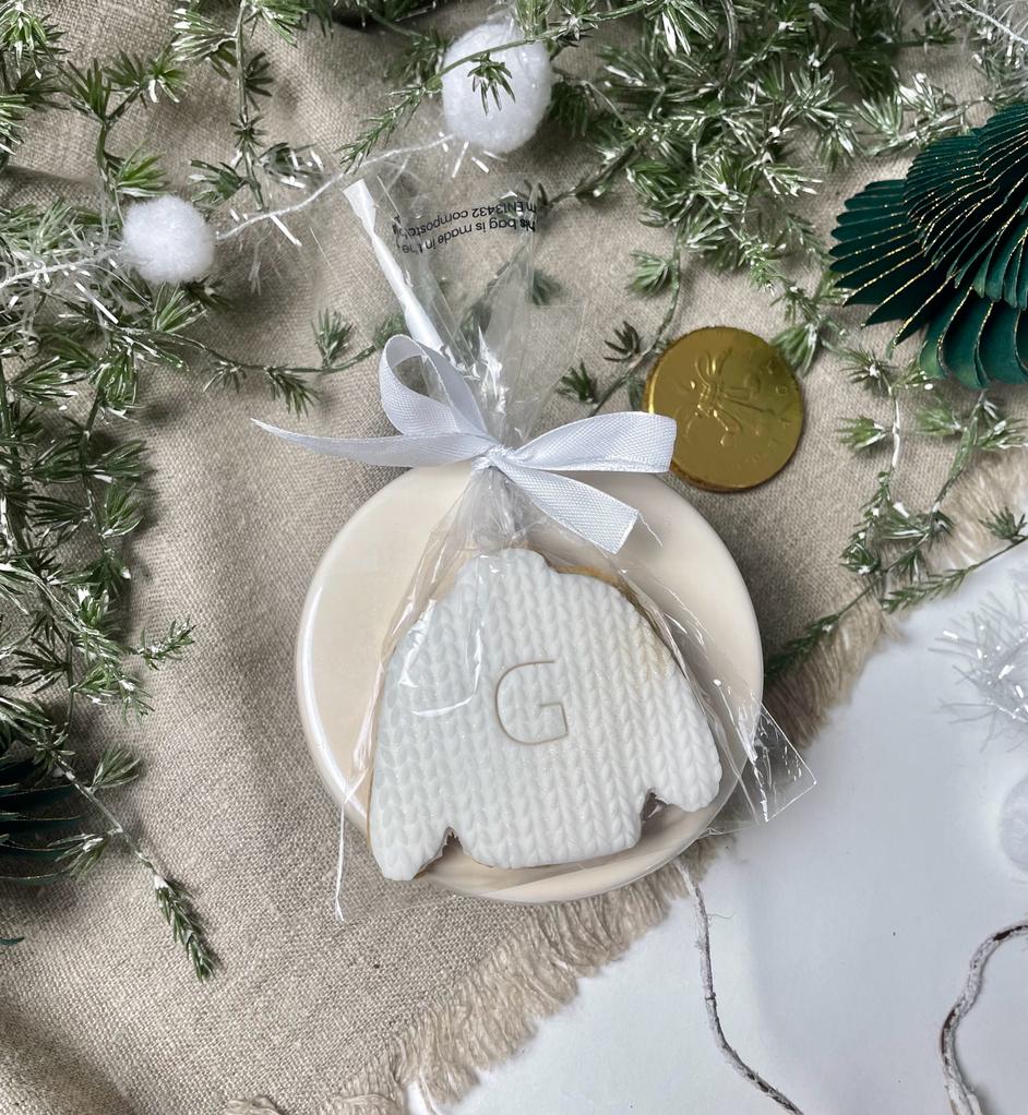 A festive white Christmas jumper biscuit with a hint of glitter, sealed with a bow and with your required initial. These make perfect table favours, stocking fillers or extra little gifts.