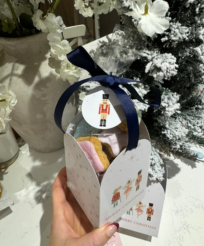 A lovely Nutcracker themed open box, filled with x12 bitesize xmas biscuits packaged in a bag and sealed with a bow/label.