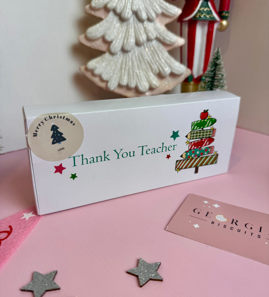 A lovely 'Thankyou Teacher' printed gift box, with x2 vanilla iced Christmas biscuits inside.